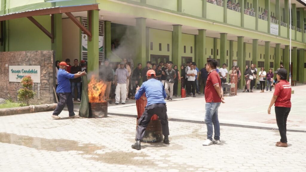 Kegiatan kemudian dilanjutkan dengan praktik lapangan bersama Damkar Kabupaten Jayapura. Para relawan mendapatkan penjelasan mengenai penyebab kebakaran, jenis-jenis alat pemadam, serta teknik penanganan api menggunakan berbagai media, termasuk penggunaan Alat Pemadam Api Ringan (APAR) yang disesuaikan dengan jenis kebakaran.